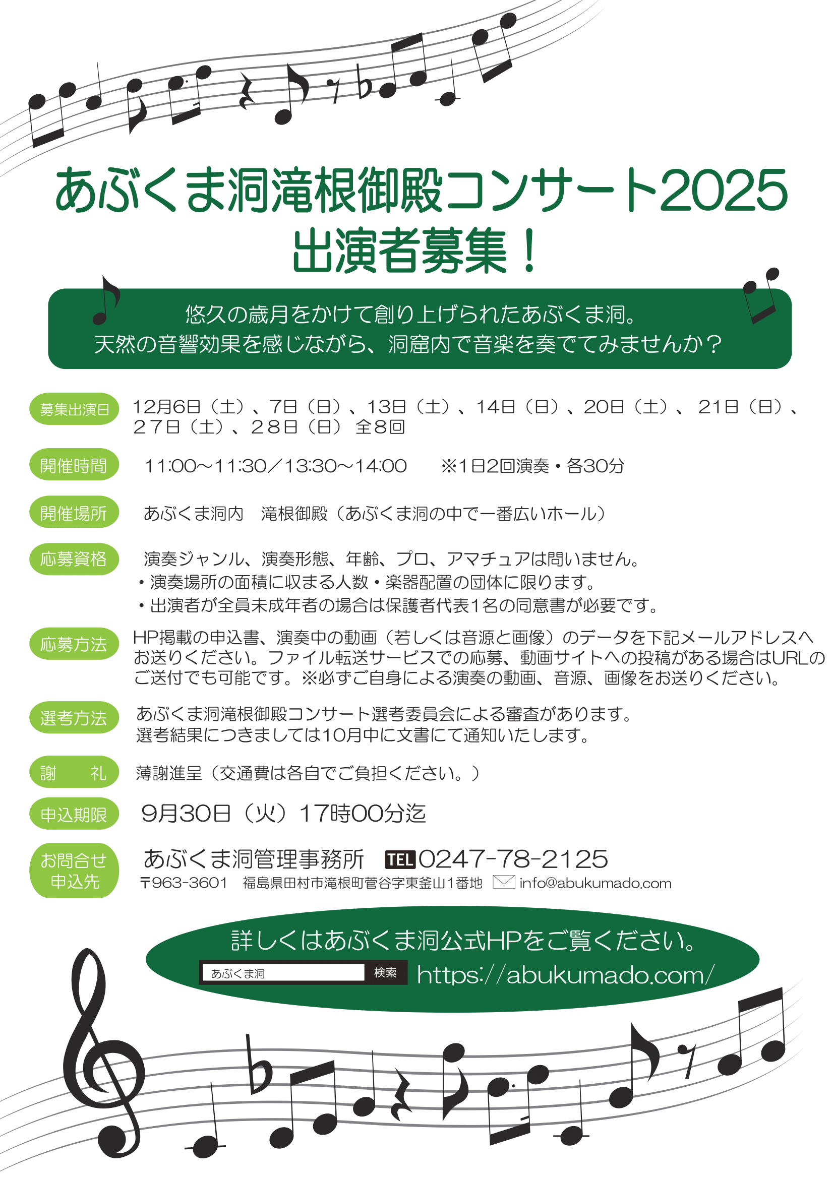 あぶくま洞滝根御殿コンサートで演奏していただける方を募集中!