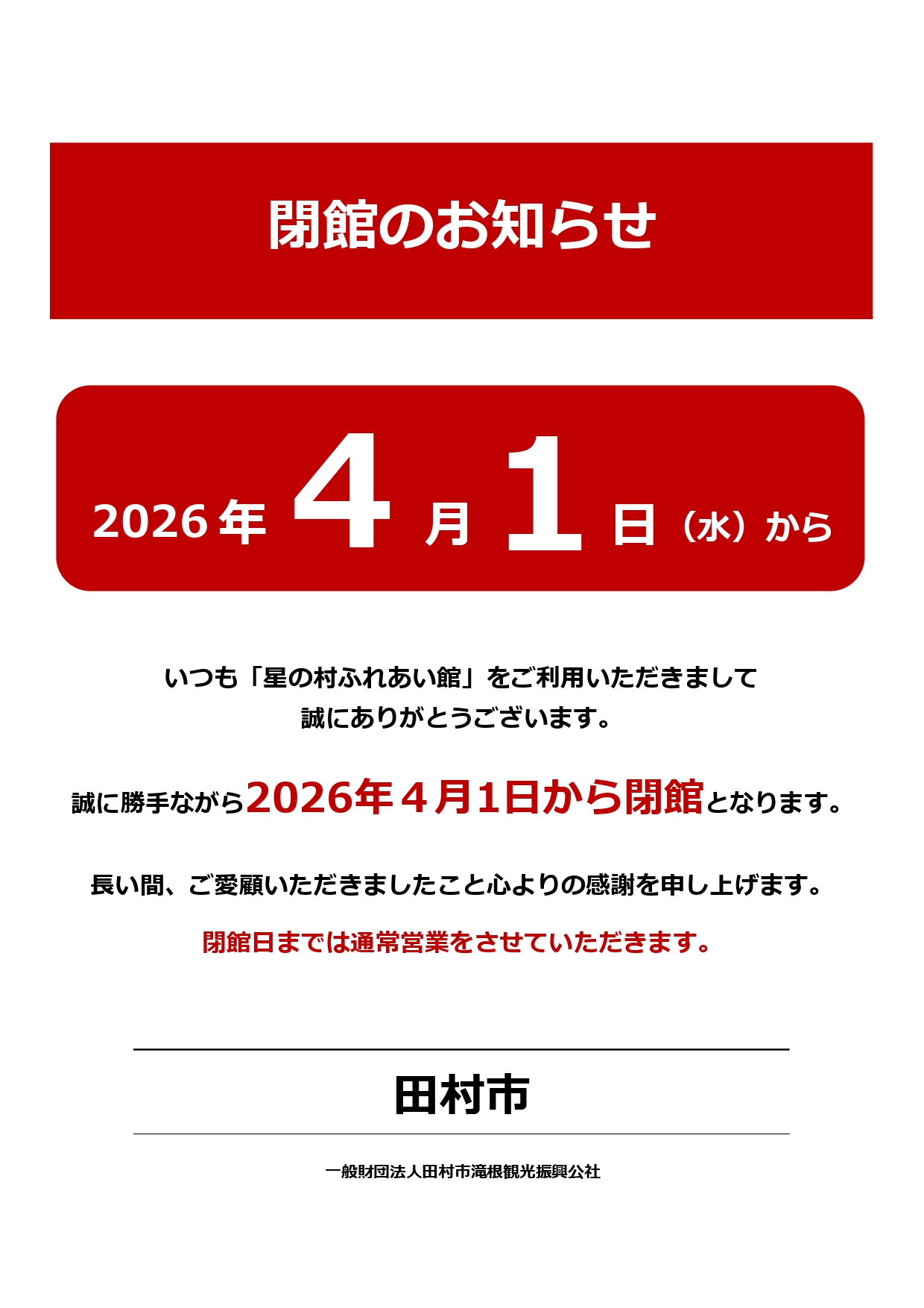 4月1日(水)以降の営業につきましては、田村市がおこなった指定管理者募集に応募が無かった為、閉館となります。