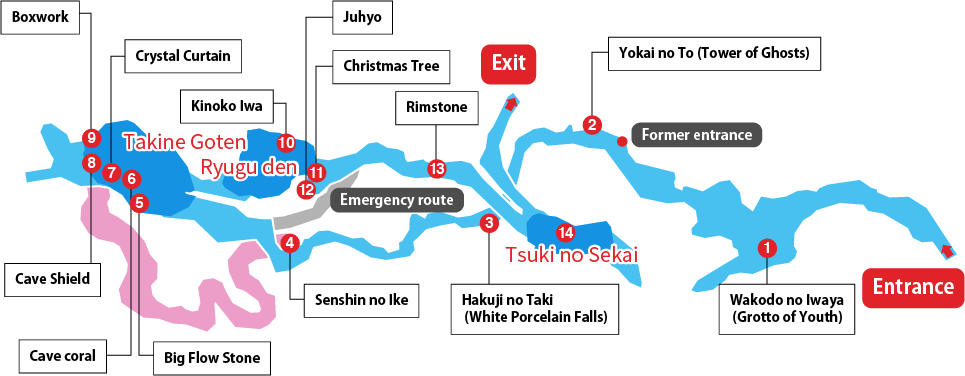The cave is divided into three levels. In Takine Goten, the largest of the halls, visitors can appreciate the Crystal Curtain, Boxwork, cave shield, cave coral, and other invaluable stalactites only found here, up close.